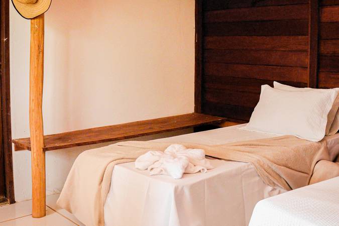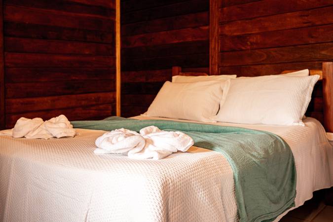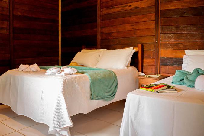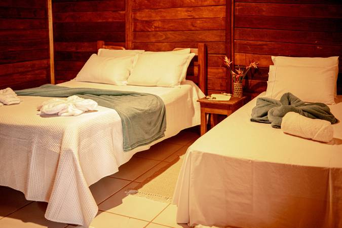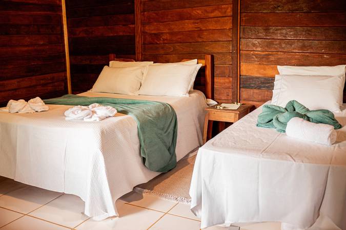 Chalé espaçoso e confortável, com uma cama de casal e uma de solteiro, ideal para pequenos grupos ou famílias.